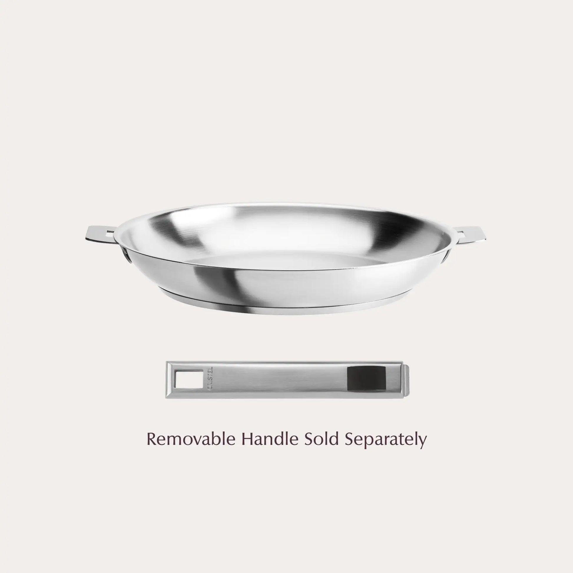 Stainless steel Frying pan 18/10, brushed finish, detachable handle, from Strate®collection. A must have in the kitchen, Strate®frying pans are available in 6 sizes: 8”, 8.5”, 9.5”, 10”, 11” and 12”. Ideal for searing meat, stainless steel frying pans with detachable handle allow, thanks to the quality of their diffuser base, to cook perfectly without water or oil or fat.